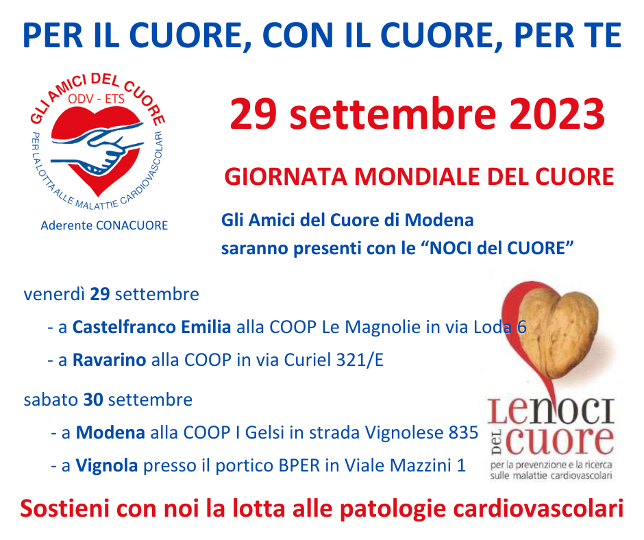 Gli Amici del Cuore, associazione aderente al Conacuore, sostengono fortemente i principi della Giornata mondiale del Cuore e saranno presenti con le “NOCI del CUORE” a Modena, Castelfranco Emilia, Ravarino e Vignola.