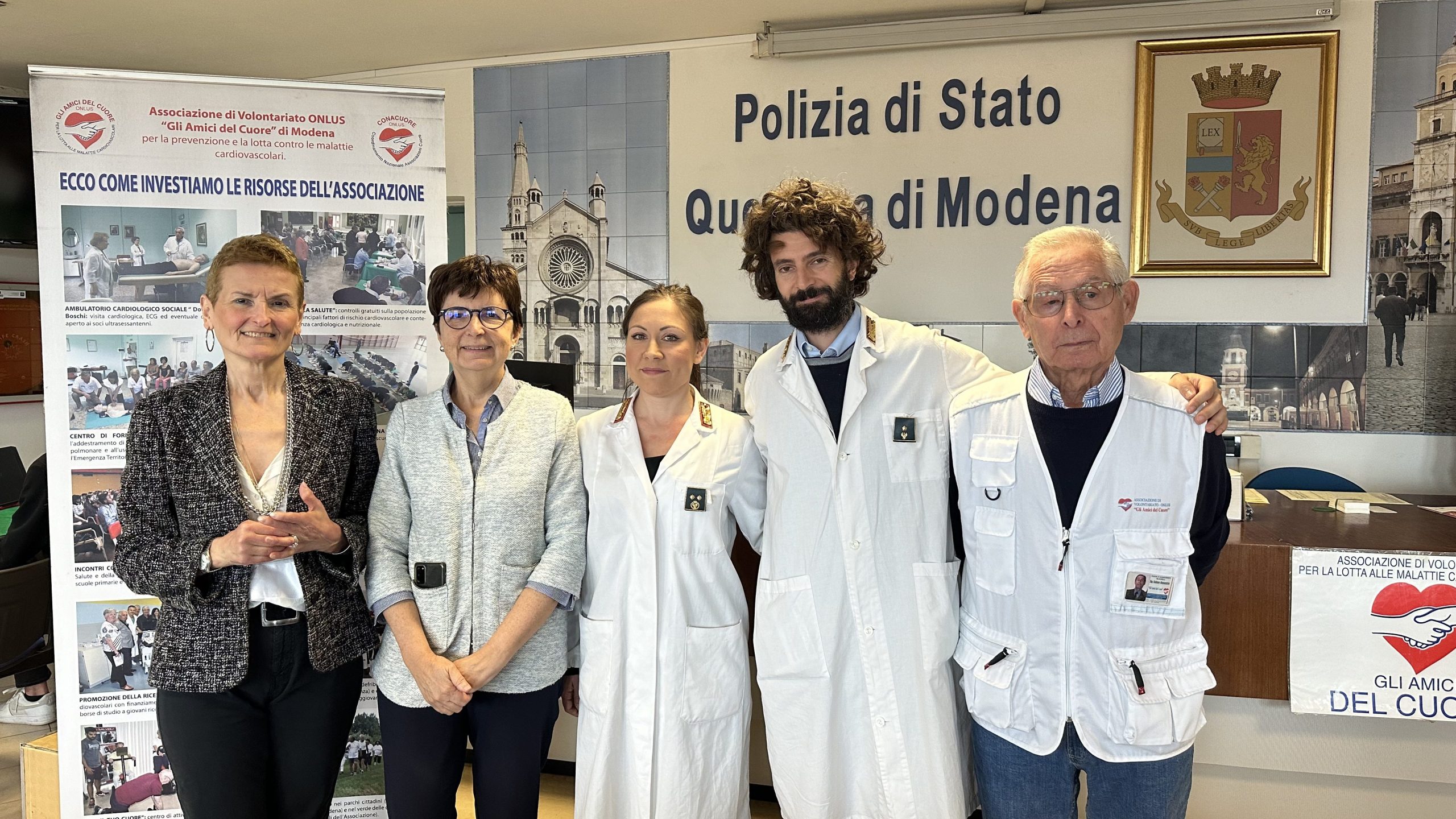 La visita fa seguito al recente episodio di salvataggio di una bambina undicenne davanti alle scuole Muratori di Vignola, per il quale è stato determinante l’intervento tempestivo con massaggio cardiaco e uso del defibrillatore da parte degli agenti, che frequentano periodicamente i nostri corsi di formazione e retraining BLS-D..